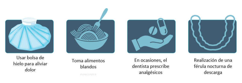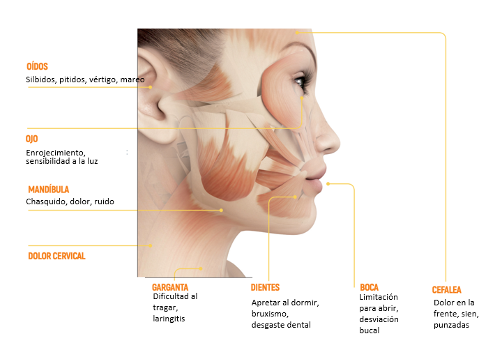 Los síntomas de este cuadro son muy diversos y muchas veces pasan desapercibidos al atribuirlos a otras causas. Puede originar cefalea crónica, sensación de presión y zumbidos en los oídos, molestias más o menos severas al masticar, dolor en cara o en mandíbula. A veces, se acompaña de chasquidos y ruidos al abrir y cerrar la boca. También puede existir una limitación funcional para abrir completamente la boca.