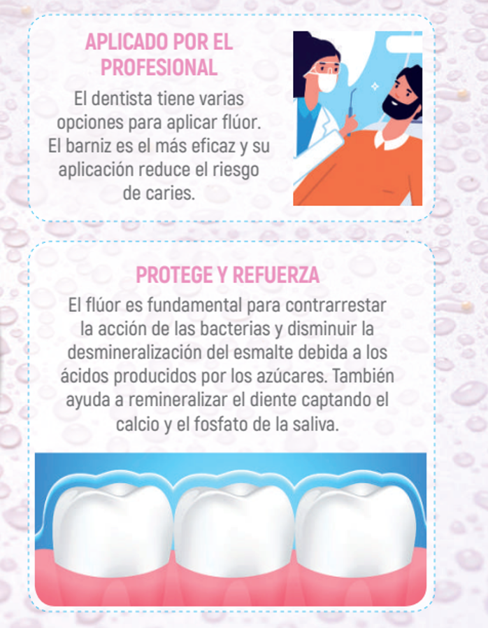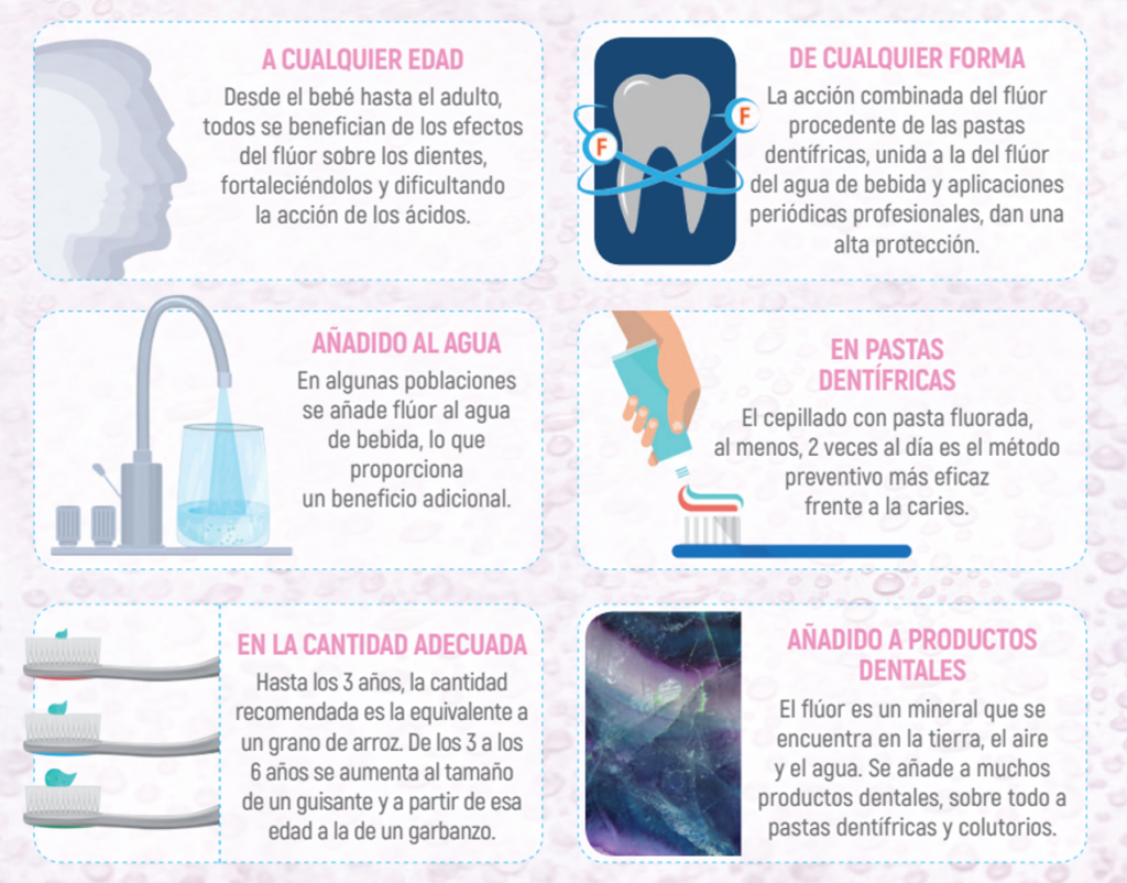 El flúor es un mineral natural que se encuentra en la tierra, el agua y el aire. Desde mediados de los años 50 del siglo pasado ha sido incorporado artificialmente en numerosos productos dentales, sobre todo en pastas dentífricas y a colutorios. Todos los estudios han demostrado que el flúor es una de las medidas más eficaces para prevenir la caries. A pesar de tener algunos detractores, ningún estudio ha sido capaz de mostrar que el flúor produzca ningún daño cuando se utiliza a las dosis indicadas en Odontología.