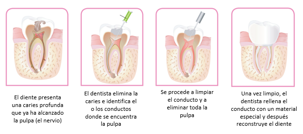 Los dientes presentan una zona interna en la que se encuentran los vasos sanguíneos, así como estructuras nerviosas. A ese tejido se le llama pulpa. En ocasiones, como consecuencia, sobre todo, de una caries muy profunda o de un traumatismo (aunque pueden existir más causas), la pulpa se ve dañada de manera irremediable. Suele aparecer dolor y, en ocasiones, infección en el interior del diente. Eso lleva a tener que realizar un tratamiento denominado endodoncia y que consiste en retirar el tejido dañado (la pulpa) y sustituirlo por un material.
