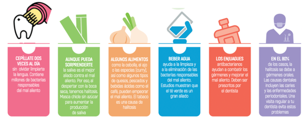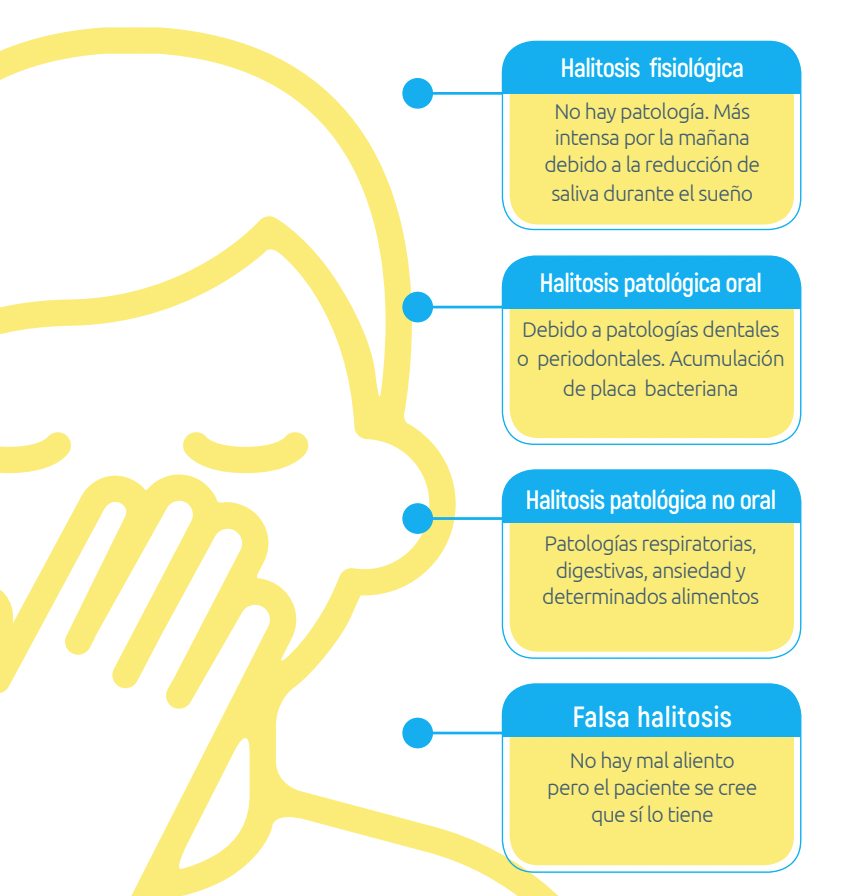Si bien, la mayoría de las veces, el mal aliento (halitosis) tiene su origen en problemas bucodentales, existen otras causas que pueden originarlo. Entre las más importantes están algunos problemas respiratorios, digestivos, el estrés o el consumo de algunos alimentos. Puede llegar a producir problemas de relaciones interpersonales.