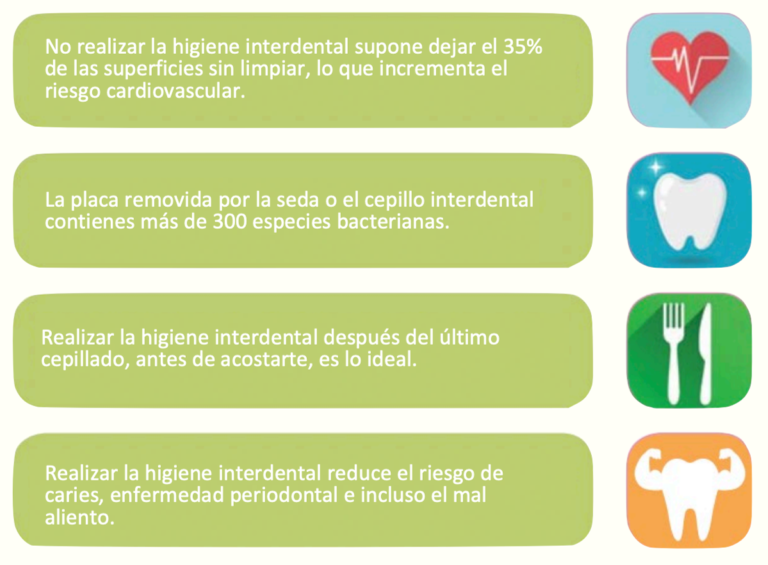 La higiene interdental remueve los restos de alimentos y las bacterias que se acumulan entre los dientes antes de que se forme el biofilm (la placa), responsable de la caries, gingivitis, periodontitis y perdida del diente. De no realizarse, el 35% de las superficies dentarias no se limpiarán. Puedes realizarla con seda dental o con cepillos interdentales.