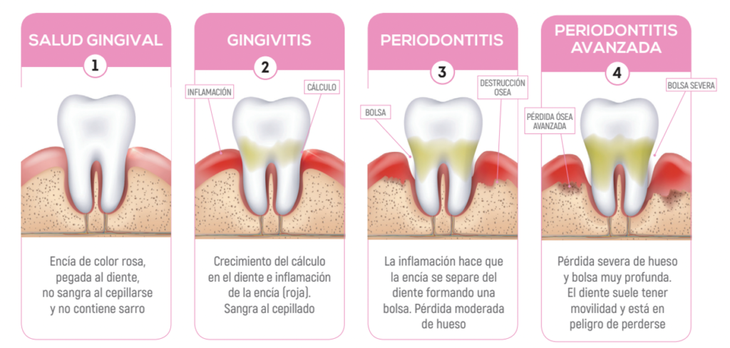 La encía normal es de color rosa, no sangra y está pegada a los dientes. Cuando se inflama aparece la llamada gingivitis, que se manifiesta por una inflamación y sangrado gingival. En este momento, si se adoptan las medidas oportunas y se refuerza la higiene, la enfermedad se resuelve sin ningún problema. Si, por el contrario, no controlamos esta inflamación, la patología progresa y empieza a afectar al hueso que rodea a los dientes de manera