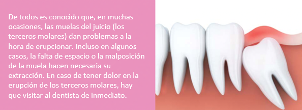 La boca pasa por varias etapas de la erupción de los dientes. Después de la salida de los dientes temporales (entre los seis meses y los dos años de edad), empiezan a aparecer las primeras muelas definitivas a los seis años. Los dientes permanentes terminan de erupcionar alrededor de los 12 años con la excepción de los terceros molares, que suelen salir entre los 17-22 años, razón por la cual se les llama “muelas del juicio”, porque aparecen a una edad adulta.