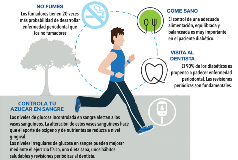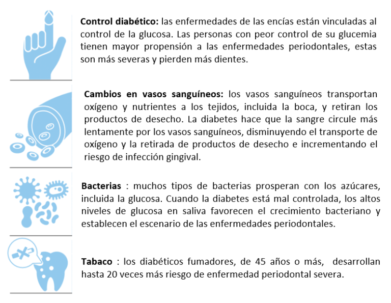 Existen unos 5 millones de diabéticos en España y 1 de cada 3 adultos es prediabético. Se ha comprobado que aquellos diabéticos que presentan enfermedad periodontal, tienen más dificultad para controlar sus niveles de glucemia. Del mismo modo, el ser diabético predispone a la enfermedad periodontal. Una óptima salud bucodental en el diabético es clave para controlar la enfermedad de base.