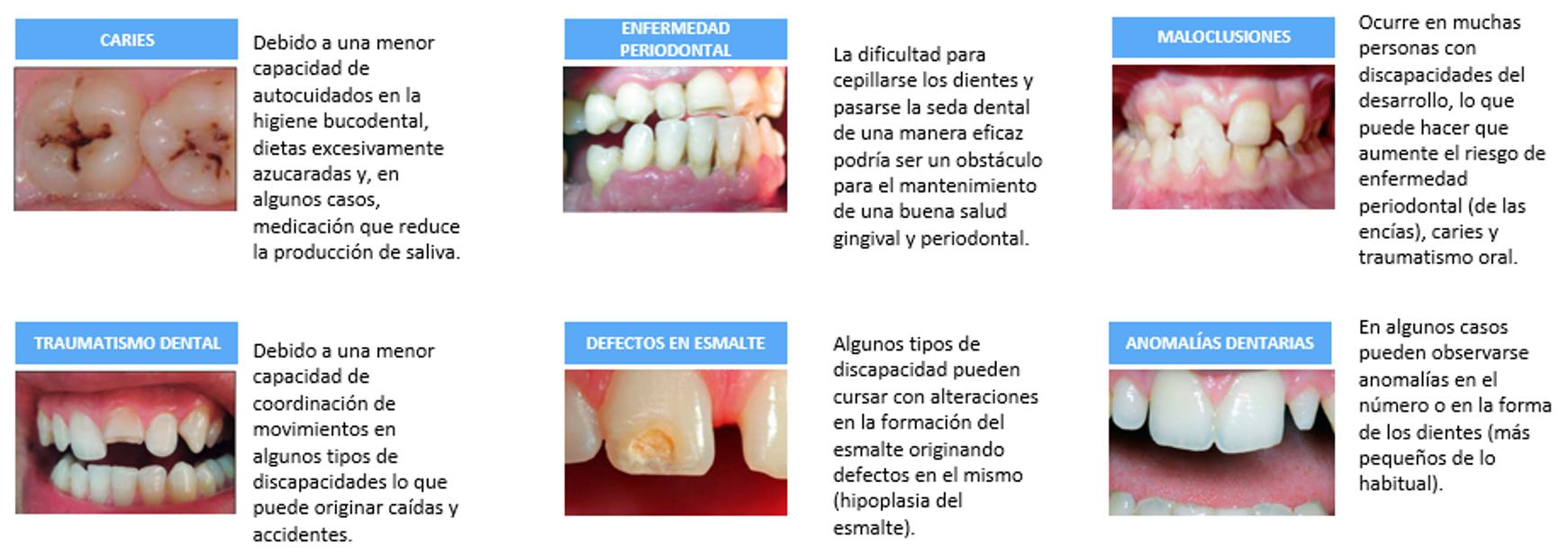 La salud bucodental en las personas con discapacidad puede verse comprometida por varias razones. Este apartado contiene información de interés sobre las principales patologías bucodentales. En Salud Oral y Discapacidad, encontraras todos los consejos, tanto para el paciente como para sus cuidadores, sobre las medidas adecuadas para mantener una óptima salud oral.